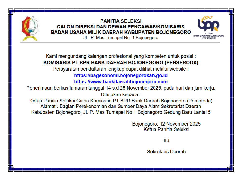 Hasil seleksi administrasi Bakal Calon Dewan Pengawas PD BPR Bank Daerah Bojonegoro Tahap II Tahun 2024...