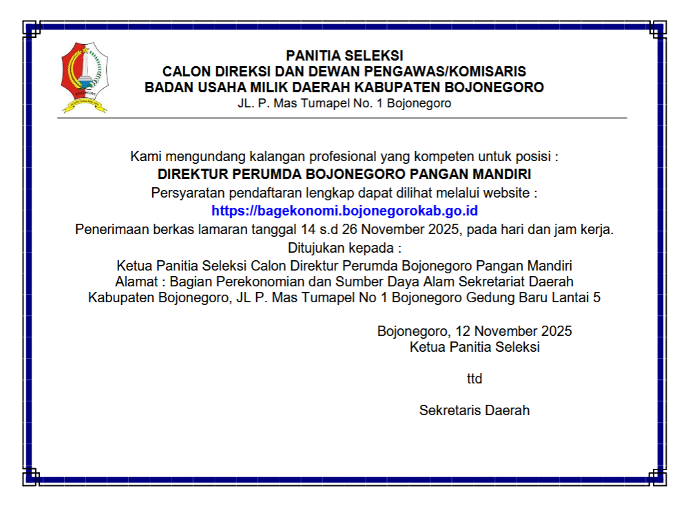 PANITIA SELEKSI CALON DIREKSI DAN DEWAN PENGAWAS/KOMISARIS BADAN USAHA MILIK DAERAH KABUPATEN BOJONEGORO Jl. P. Mas Tumapel No. 1 Bojonegoro Kami mengundang kalangan professional yang kompeten untuk posisi: DIREKTUR...