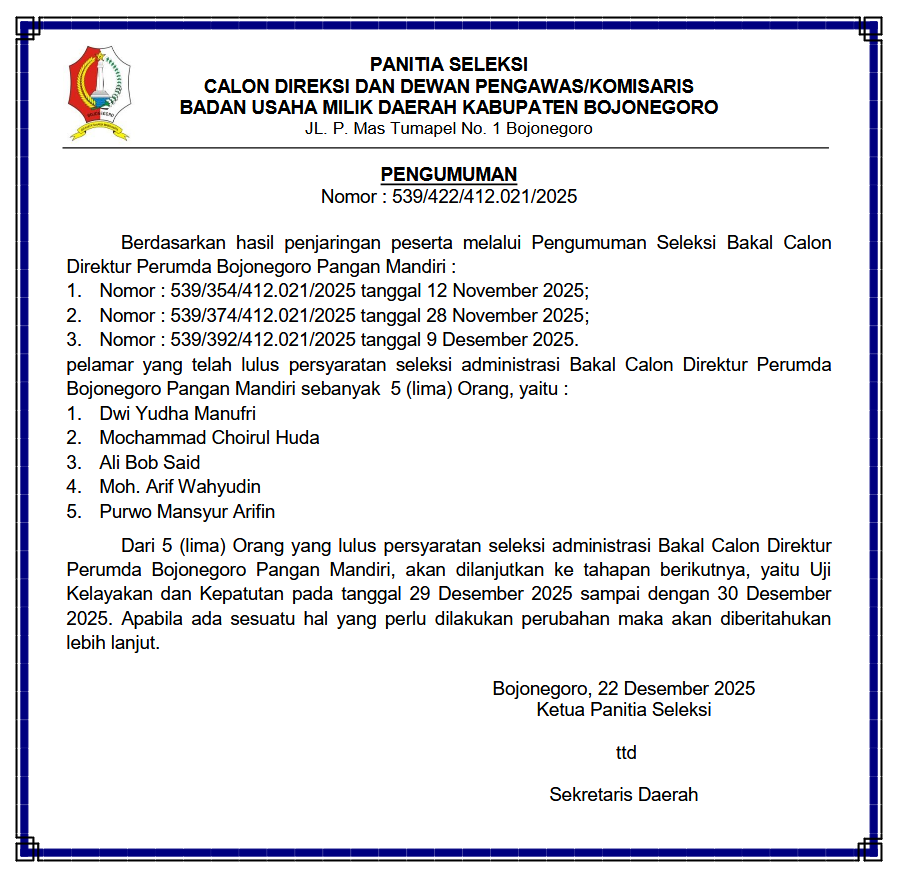 Hasil Seleksi Administrasi Bakal Calon Direktur Perumda Bojonegoro Pangan Mandiri